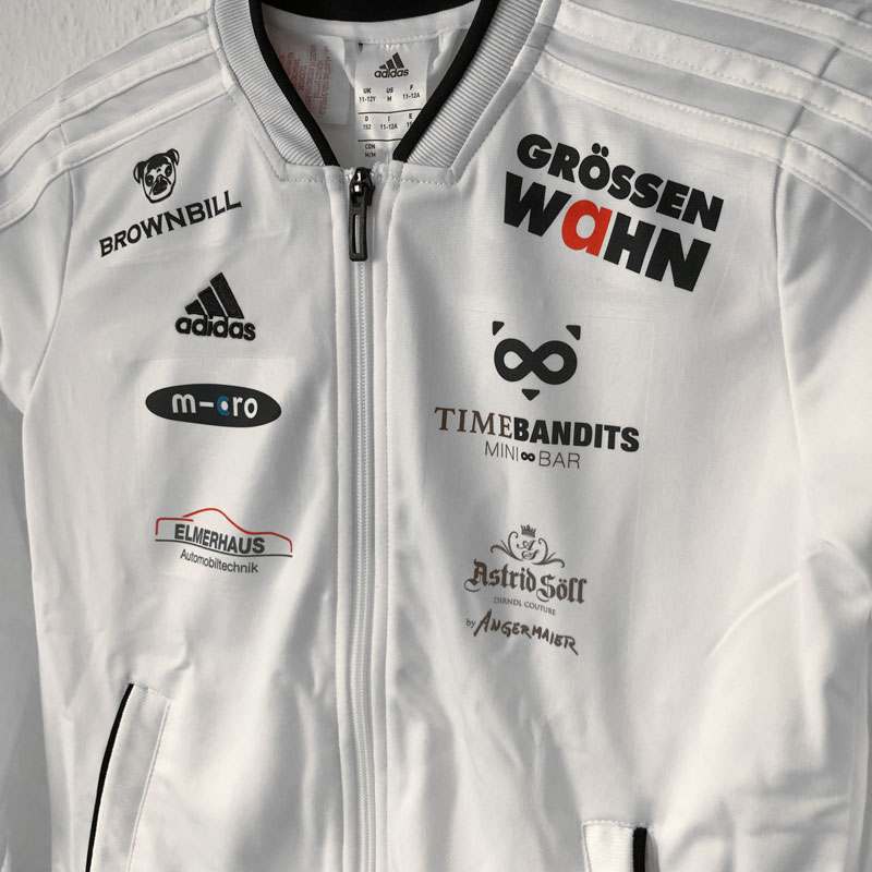 Bei dem Auftrag haben sich die TimeBandits neben den adidas Trainingsjacken aus unserem Shop für einen mehrfarbigen Sublimationsdruck entschieden. Durch das Druckverfahren ist es möglich das gleich mehrere Logos in unterschiedlicher Farbe aufgedruckt werden können.