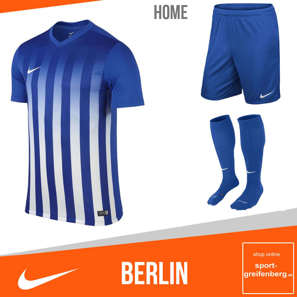 Die Nike Berlin Trikots 2017/2018 bleiben Blau/weiß. Für den eigenen Trikotsatz von Nike mit den Farben von Hertha BSC gibt es das Nike Striped Division II Jersey/Trikot. Für einen kompletten Nike Trikotsatz in den Hauptstadt-Farben passen zum Trikot die Nike Park II Knit Short und die Nike Classic II Socks.