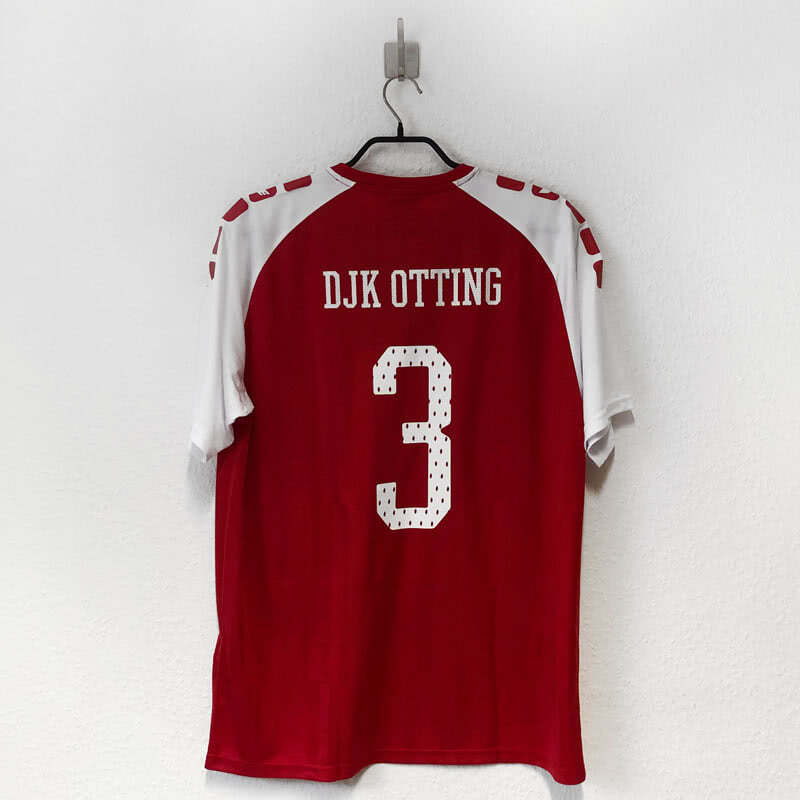 Der DJK Otting hat sich dabei für rote Erima Trikots mit 5-Cubes Elemente aus unserem Shop entschieden. Passend dazu haben die Trikots eine Bedruckung mit unserer Promesh Schriftart erhalten. Sowohl die Rückennummern wie auch der Vereinsname sind in der ausgefallenen Schriftart gehalten.