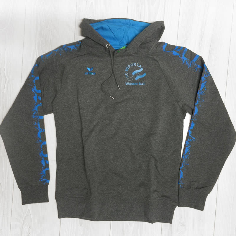 Die Wasserballer des SC 80 Porta dürfen sich über neue Kapuzensweatshirts mit Aufdruck freuen. Dabei setzen die Wasserballer auf einen Druck mit dem eigenen Vereinslogo und einem Wasserball Logo auf dem Rücken. Damit das Erima Kapuzensweat aus unserem Shop einen einheitlichen Look erhält, ist die komplette Bedruckung in den farblichen Elementen des Sweatshirts gehalten. Das auffällige Erima Design im Bereich der Arme (5-Cubes Look) wird somit bestens integriert.