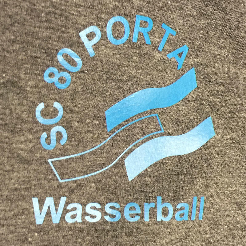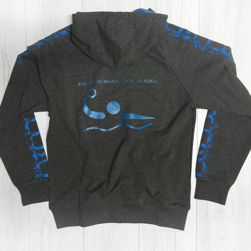 Neben dem Vereinslogo Druck auf dem Kapuzensweat kommt im Rückenbereich ein großes Wasserball Logo zum Einsatz. Über dem Logo wurde zudem noch der Slogan „Passion for Water“ und der Vereinsname SC 80 Porta verwendet. Als Art Der Bedruckung kam dabei ein Plastisoldruck zum Einsatz, der dafür sorgt, dass vor allem die Farbe aus dem Armbereich besonders genau passt.