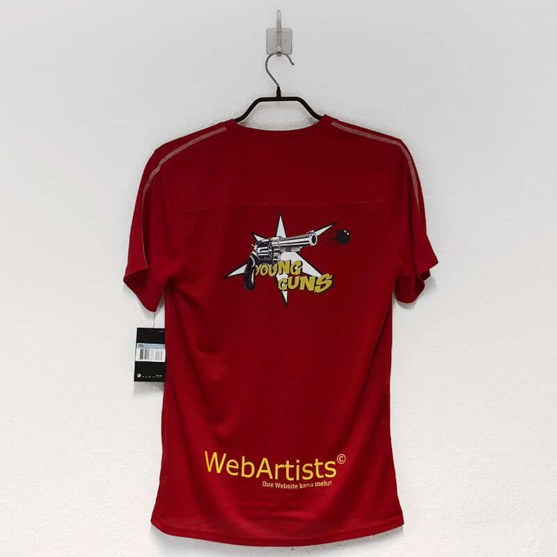 Entschieden haben sich die webartists für eins der funktionellen Nike Training Jerseys aus unserem Shop mit einfarbiger Optik. Damit das Jersey sofort ins Auge fällt kommt als Bedruckung eine mehrfarbige Grafik und das eigene Unternehmenslogo zum Einsatz.