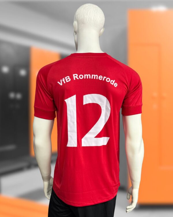 Trikots die schon ein Grafik Muster haben sind immer etwas schwieriger zu bedrucken. Das ein Grafik Muster bei Trikots aber kein Hinderungsgrund für eine Bedruckung sind zeigen diese roten Jako Trikots des VfB Rommerode.
