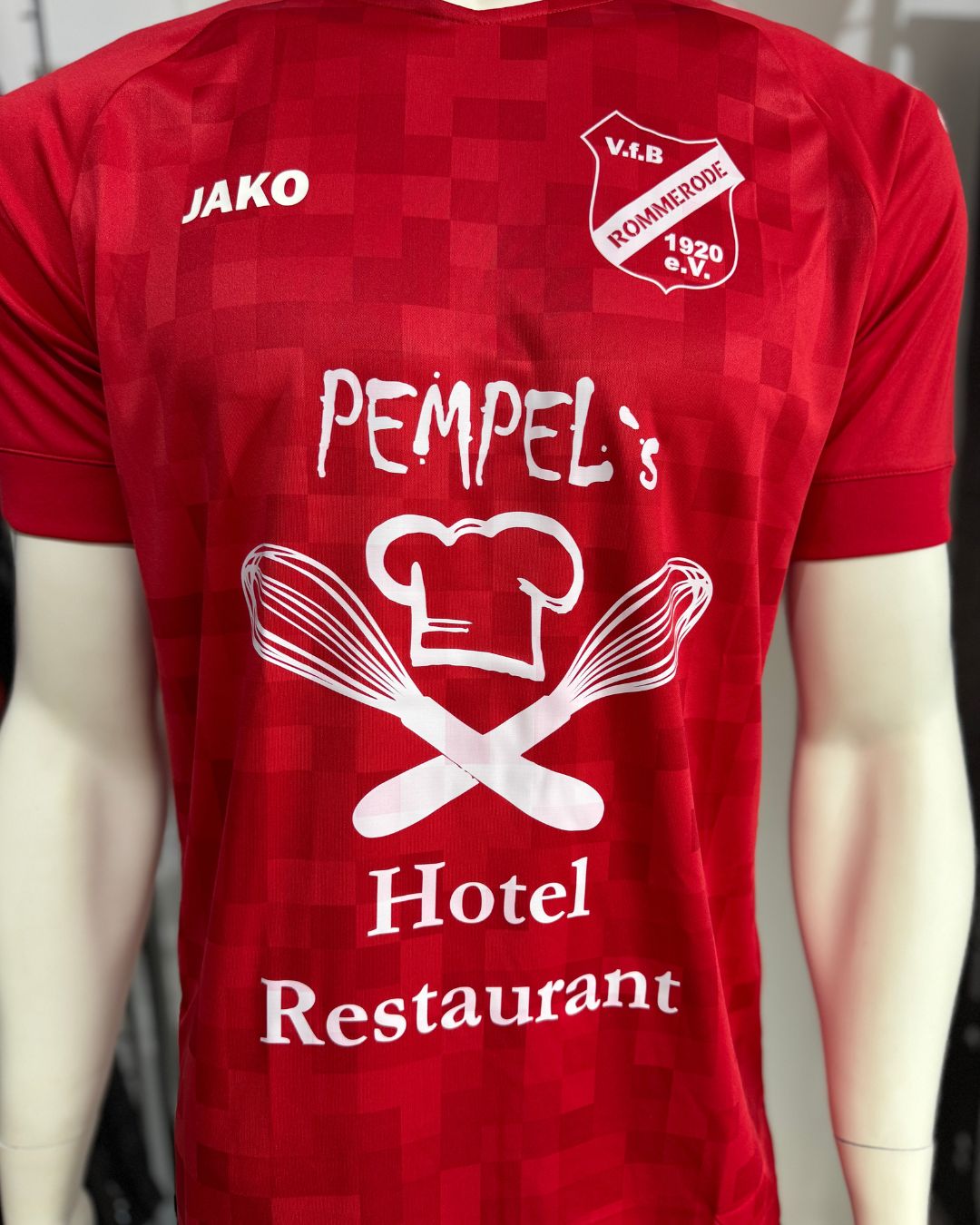 Trikots die schon ein Grafik Muster haben sind immer etwas schwieriger zu bedrucken. Das ein Grafik Muster bei Trikots aber kein Hinderungsgrund für eine Bedruckung sind zeigen diese roten Jako Trikots des VfB Rommerode.