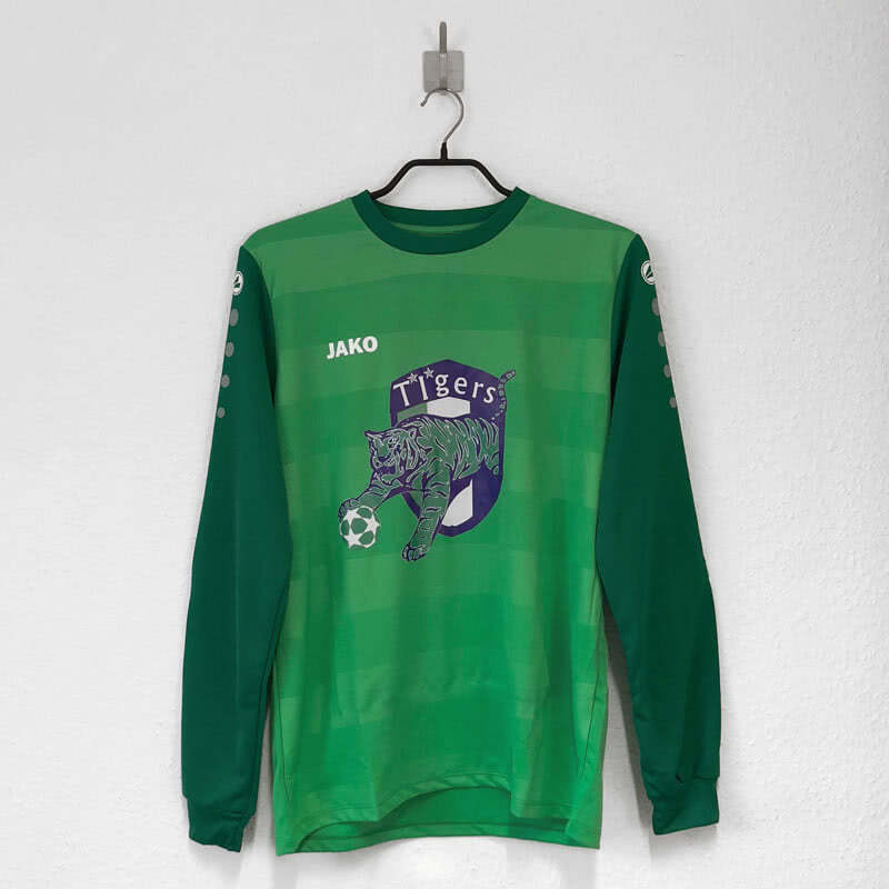 Bei einem normalen Torwart Trikot für einen Trikotsatz im Ligaspielbetrieb ist eine solche Grafik zwar nicht möglich aber trotzdem kannst auch du etwas von Torwart Jersey der Tigers übernehmen. Neben dem Langarm Torwarttrikot von Jako aus unserem Shop haben sich die Tigers nämlich auch für eine farbliche Bedruckung Ihres Wappens auf der Trikotbrust entschieden.