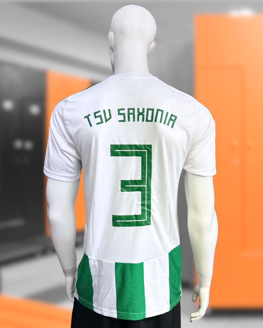 Bei Trikots mit einem Streifen Design muß man bei der Bedruckung immer etwas aufpassen damit der Sponsor später auch gut zu erkennen ist und das Vereinslogo richtig platziert ist. Wie ein solches gestreiftes Trikot mit der fertigen Bedruckung am Ende aussehen kann zeigt der TSV Saxiona bei seinem Trikotsatz.
